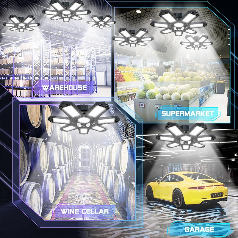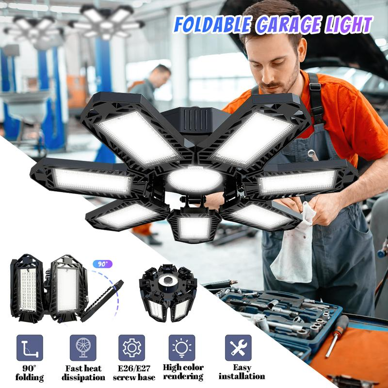This foldable multi-panel LED garage light delivers ultra-bright, 360° illumination with zero dark spots — perfect for garages, warehouses, and large workspaces.
