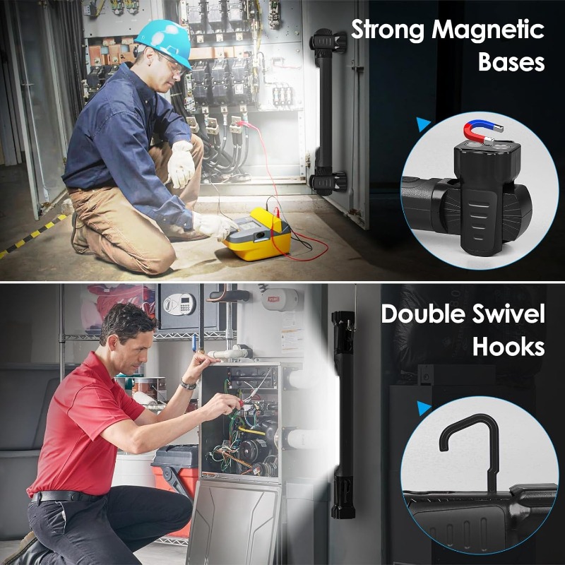 Strong magnetic bases at both ends hold firmly to ferrous metal. Aim light precisely with 360Β° swivel and 180Β° tilt. No metal? Use the double swivel hooks to hang it anywhere.
