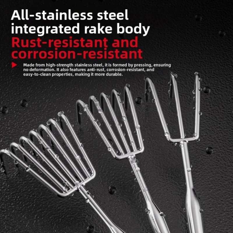 Made from 304 stainless steel, it is significantly stronger than common steel rakes — less bending, less warping, and long-term durability even in tough ground.