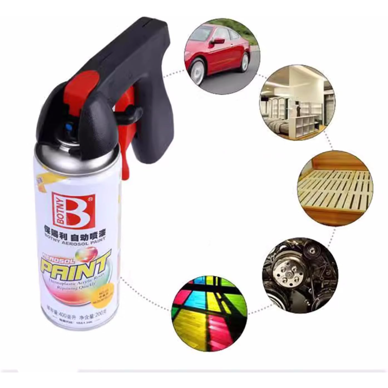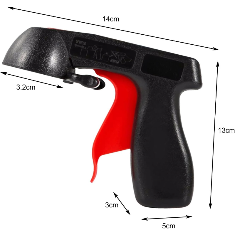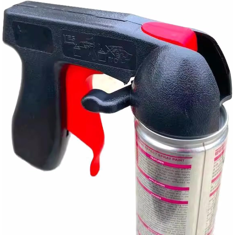 This universal aerosol trigger handle fits most pressure spray cans and is suitable for a wide range of applications, including graffiti spraying, color changing films, computer case painting, wheel hub repainting, furniture refinishing, car paint repair, model coloring, keyboard painting, and more.